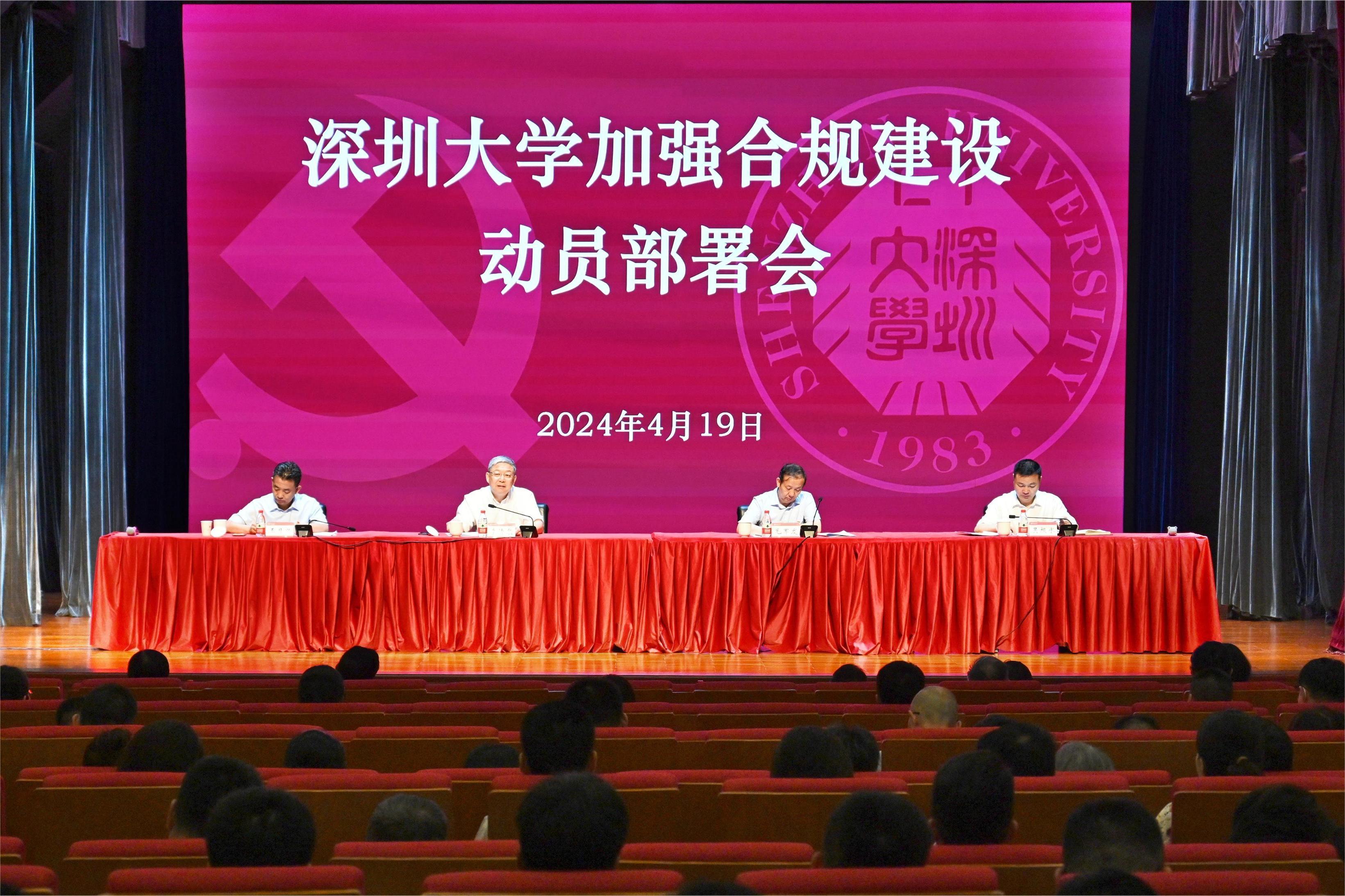 4月19日上午,深圳大学党委在粤海校区国际会议厅召开加强合规建设动员部署会。全体在家校领导,机关职能部门、直属单位、附属单位主要负责同志,各学院(部)书记、院长,全国重点实验室等国家级研究基地、独立法人科研机构、相对独立科研机构负责人,各单位纪委书记、办公室主任和党建组织员参加会议。