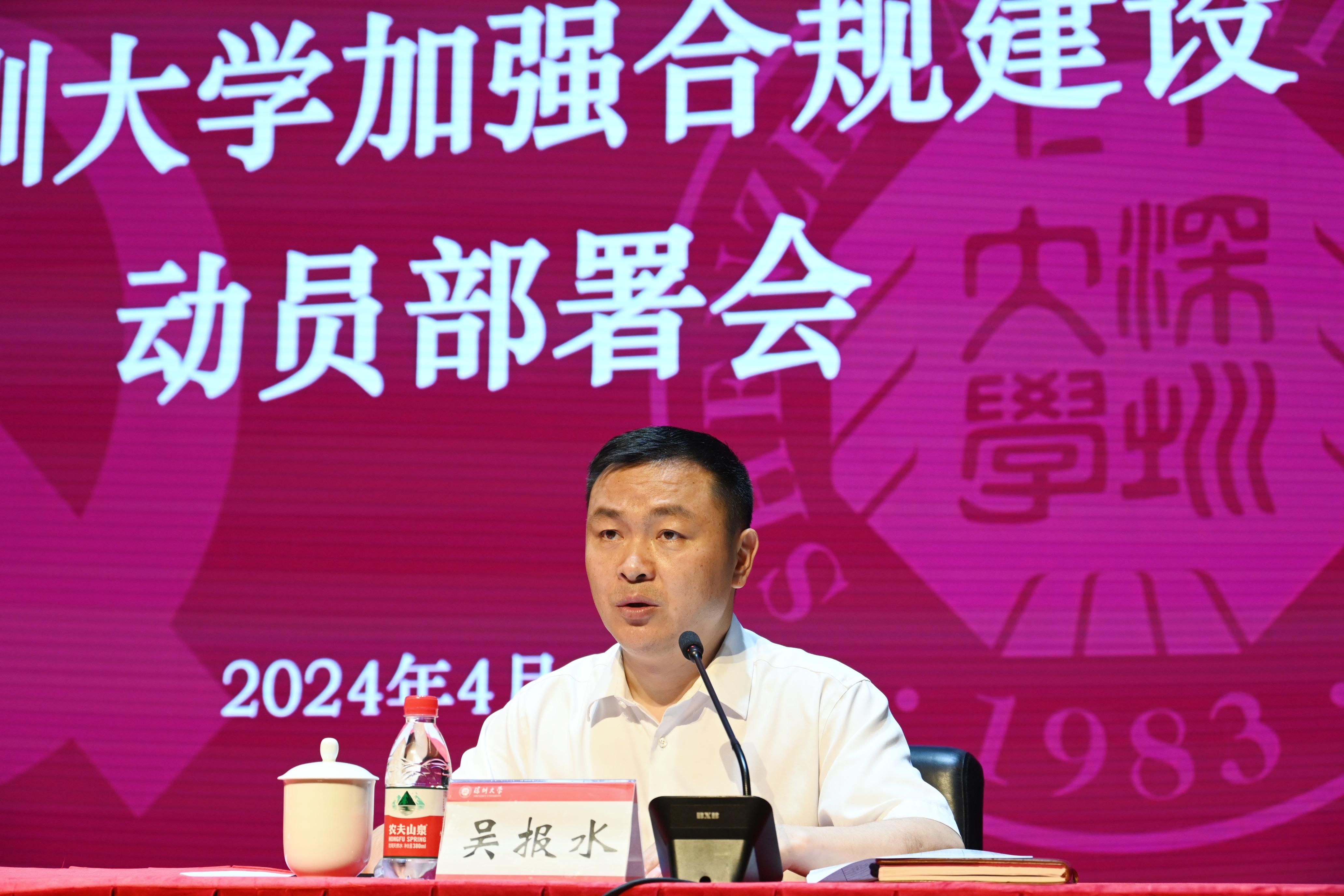 吴报水表示,加强合规建设是学校党委今年的重点工作,日前学校党委常委会审议通过了《深圳大学关于加强合规建设的实施意见》(以下简称《实施意见》)及重点任务清单。他结合《实施意见》对加强合规建设有关工作作出具体部署。一是准确把握工作目标。学校今年的工作目标是,通过扎实推进合规建设各项举措落实落地,全校教职员工合规观念入脑入心、底线意识明显增强,重点领域制度机制更加完善、合规流程指引准确明晰,学校依法治校水平明显提高、校园风清气正氛围更加浓厚。学校接下来将合规建设作为促进学校高质量发展的重要抓手持续推进,通过持续努力,全校师生员工合规意识更加牢固,学校各方面工作合规制度体系全面建立、流程指引更加规范科学,学校治理体系和治理水平现代化程度更高,探索形成一批引领高校合规建设的经验做法和理论成果,为高校治理和深圳中国特色社会主义先行示范区建设作出积极贡献。二是积极推进重点任务落实。要加强全员合规教育培训,按照《实施意见》中明确的五项重点任务,认真制定学习内容清单,开展领导干部专题学习,组织全员专题培训,丰富常态化培训方式;要聚焦合规建设重点难点,健全重点领域预防性合规体系,完善关键环节风险防控措施,明确重要岗位合规职责;要健全完善“章程、意见、制度、指引”四位一体的全覆盖合规制度体系,抓好合规制度建设顶层设计,严格落实学校章程,抓好制度梳理优化,科学制定合规指引,提升依靠制度机制管人管事水平;要建立健全合规工作机制,包括合规审查机制、风险评估预警机制、重大合规风险应对处置机制、合规建设考核和问责机制、合规指导咨询机制等;要提升合规治理整体效能,常态化开展合规建设,拓展师生员工参与合规建设渠道,开展高水平高校合规研究,加强荔园合规文化建设,全校各单位乃至全体师生员工要民主参与,各司其职,凝聚共识,形成合力。三是加强工作保障,强化责任落实。要加强组织领导,建强机构队伍,强化科技赋能,做好宣传引导。