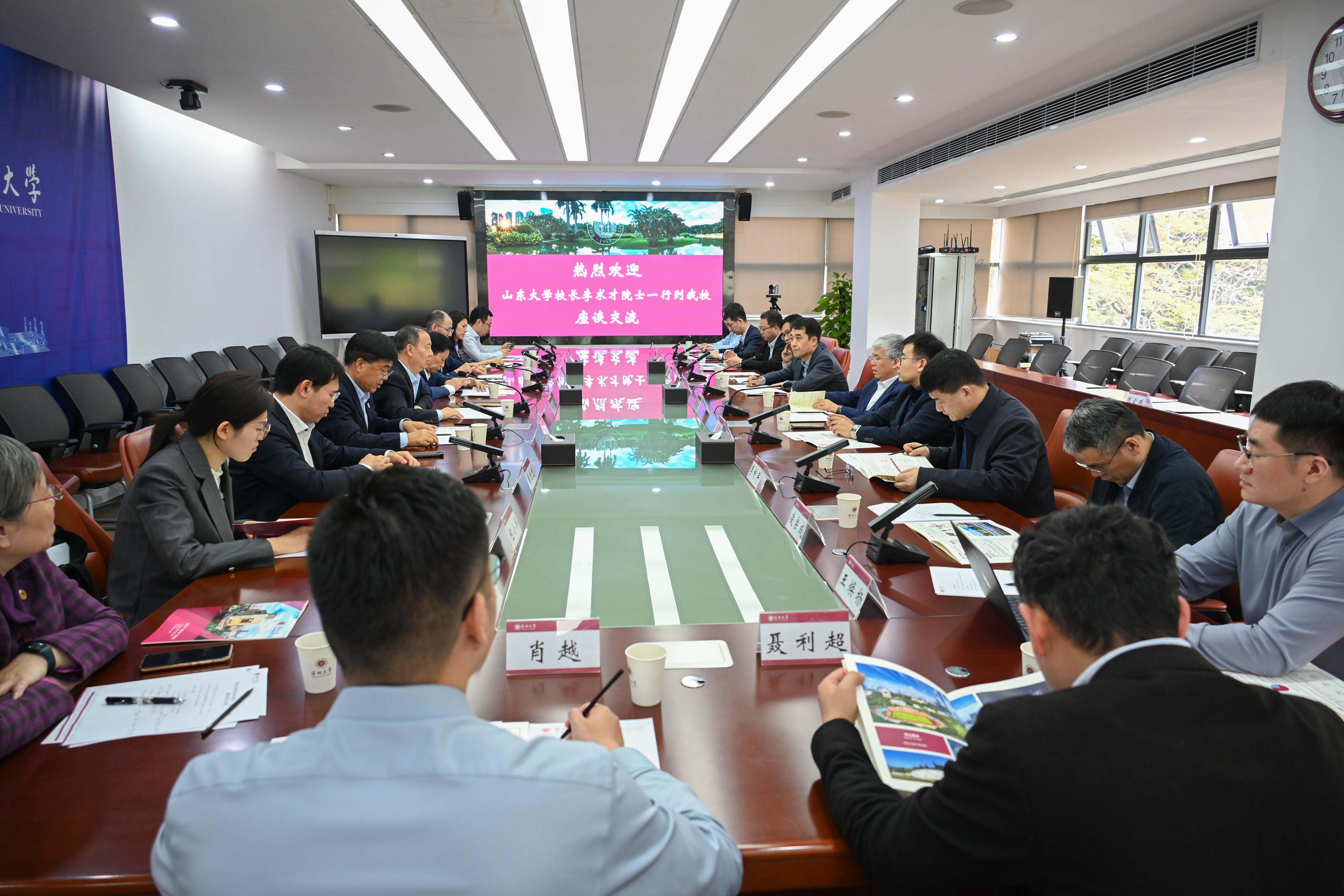 毛军发对李术才一行表示欢迎,并介绍深圳大学发展情况。他表示,深圳大学是深圳市唯一一所综合性大学,自1983年建校以来,与深圳这所城市同生共长,经过40多年的快速发展,在学科建设、人才培养、科研创新、社会服务等方面都取得了亮眼成绩。目前,全校正踔厉奋发、团结一致,全力冲刺入选“双一流”建设大学。毛军发表示,深圳大学希望与山东大学交流学习,在未来进一步加强交流合作,共同为中国高等教育作出贡献。