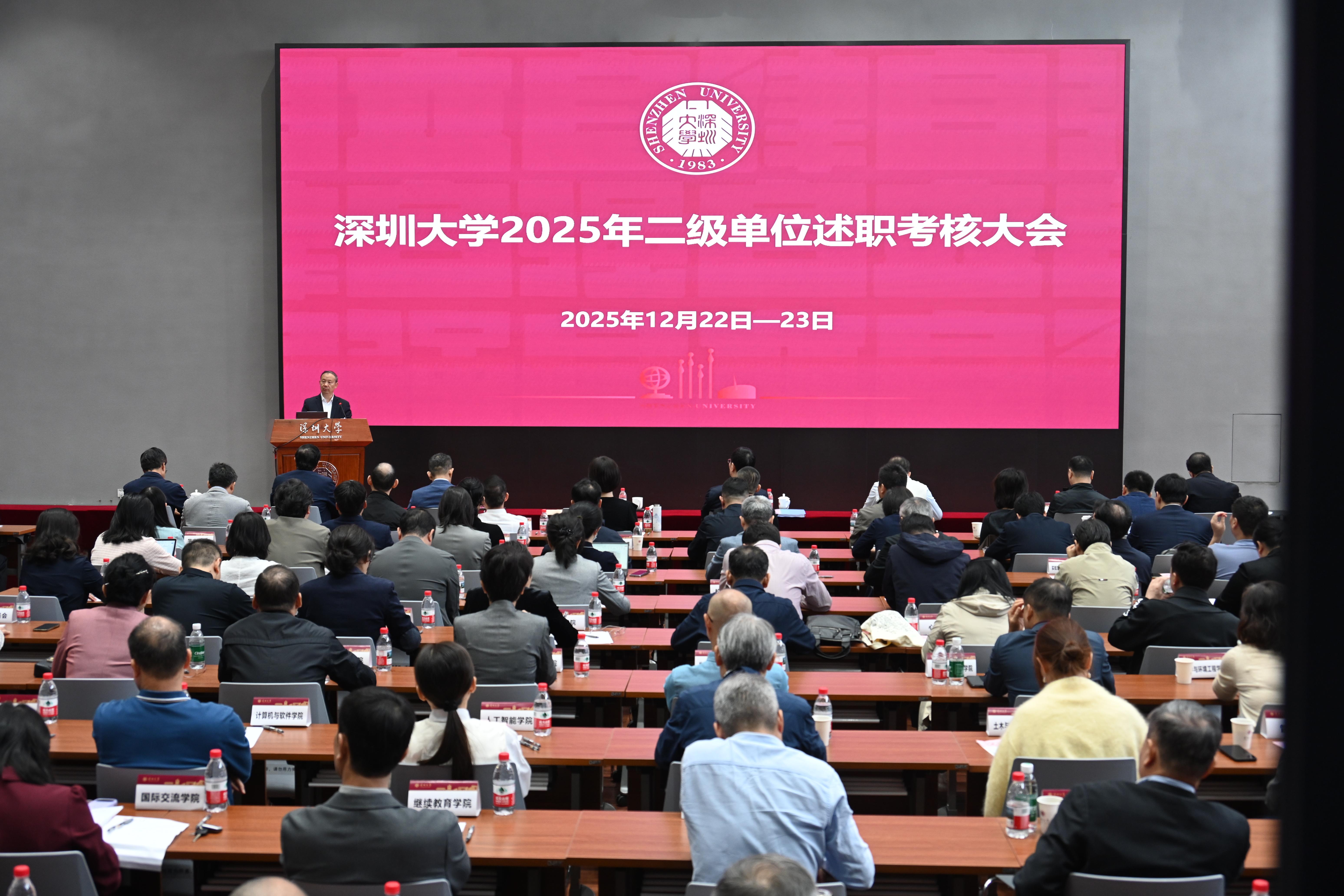 12月22日至23日,深圳大学2025年二级单位述职考核大会在粤海校区校友广场召开。校党委书记徐波、校长毛军发分别作点评讲话,党委副书记、纪委书记王月兴,党委副书记吴报水,副校长李永华、汪永成、周辉、巢乃鹏出席会议;学校各学院(部)、职能部门、直属和附属单位主要负责人、中层干部、学术委员会和教授委员会代表、教职工代表共同参会。