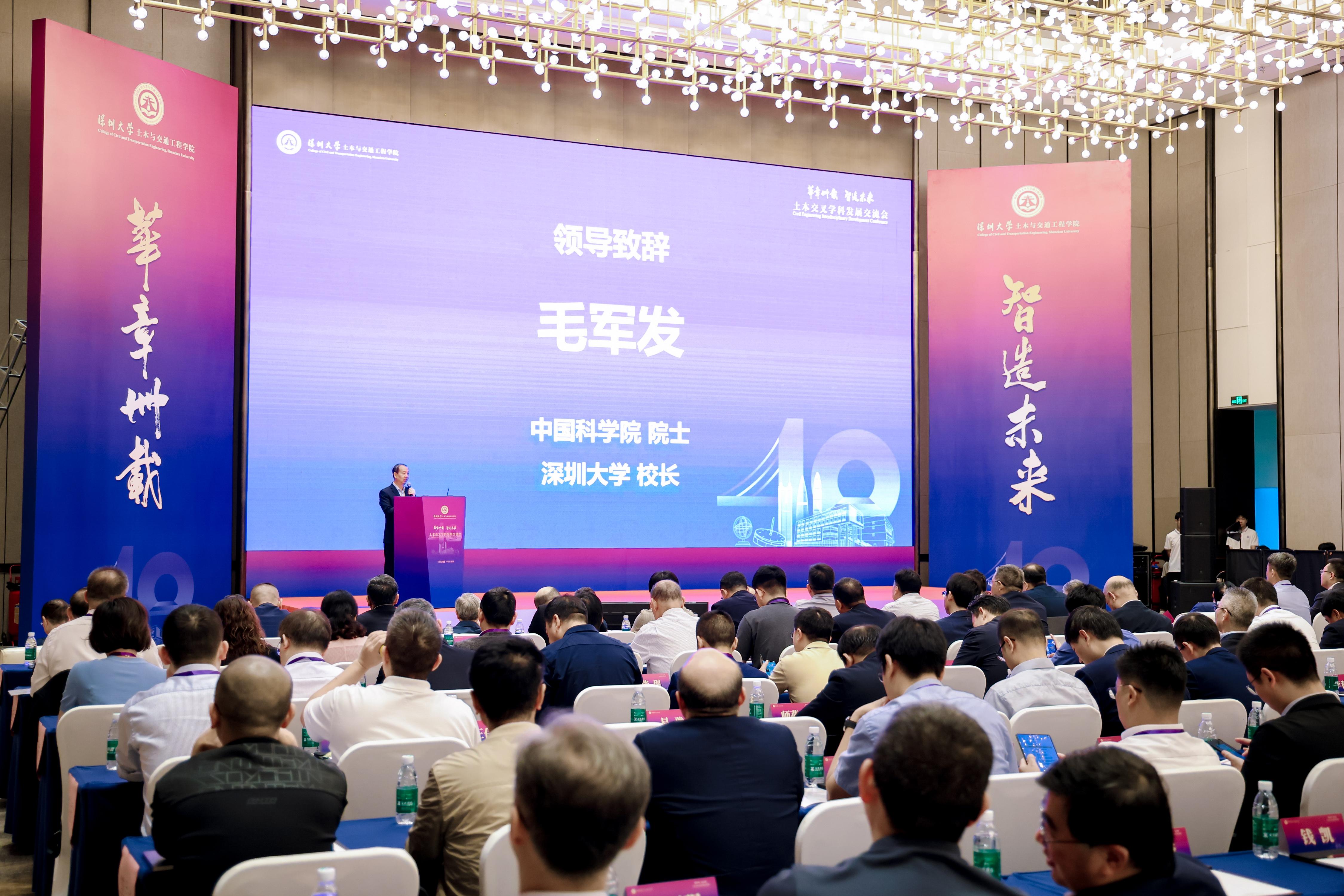 毛军发致欢迎辞。他表示,土木与交通工程学院的诞生和发展顺应了深圳作为改革开放前沿阵地的时代需求,经过不断发展迭变、融合壮大,土木学科发展成为深圳大学最好的学科之一,为学校的高质量发展作出重要贡献。