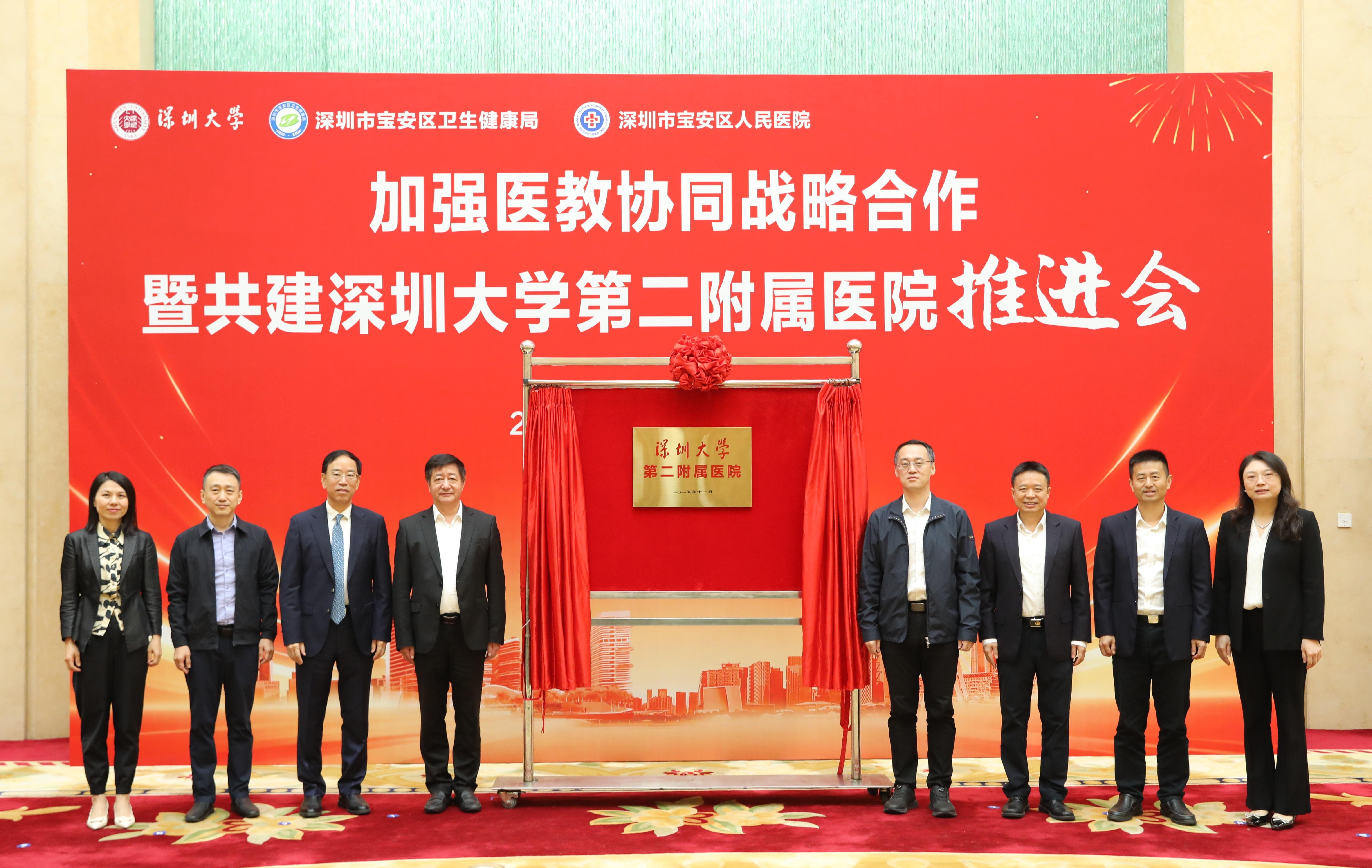 2025年11月26日上午,深圳大学与宝安区政府、宝安区卫生健康局“加强医教协同战略合作暨合作共建深圳大学第二附属医院”推进会在宝安区政府举行。宝安区政府党组成员、副区长李宏涛,深圳大学副校长李永华,校务委员会副主任、医学部主任姜保国,以及宝安区卫生健康局、区人民医院和其他区属医院、深圳大学发展规划部、医学部等单位负责同志出席活动。