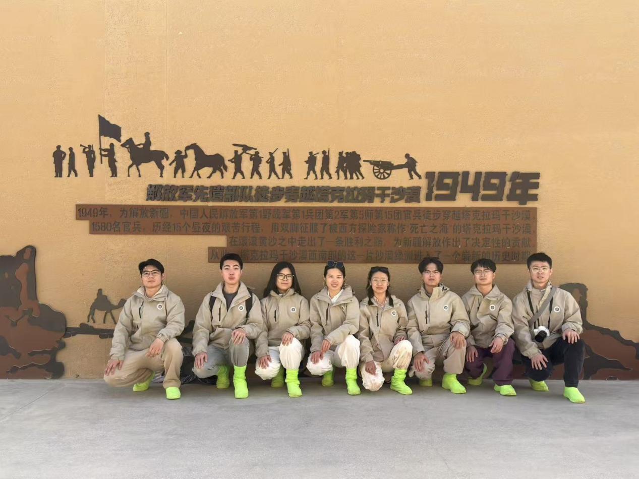 4月6日,活动的最后一天,支教团走进新疆N39塔克拉玛干沙漠研学基地,通过实地参观学习,了解新疆独特的地形地貌特征以及国家、人民长期以来抗沙防风的奋斗历程。薄老师向成员们讲述1949年解放军先遣部队穿越“死亡之海”塔克拉玛干的壮举:1580名官兵历经15个昼夜,用血肉之躯为新疆解放开辟胜利之路。茫茫沙海中,成员们亲身感受生态治理的艰辛与成就。薄老师以历史映照现实,激励团队传承“沙漠精神”——不畏艰险、扎根奉献,用青春接力边疆建设。此次研学既是一次生态教育,更是一堂生动的爱国主义和民族团结实践课,进一步增强了守护绿水青山、共建美丽家园的责任感和使命感。黄沙呼啸间,支教团成员更加坚定了服务边疆、建设祖国的信念。