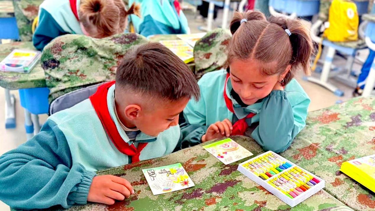 在二(2)班,一堂以“我心目中的草原”为主题的趣味美术课正在展开。深圳职业技术大学的郭安妮同学和她的团队使用油画棒,丰富孩子们的艺术体验。队员们引导孩子们回忆生活经历并参与“抓草原”互动游戏,最后的自由创作作品,尽管孩子们的笔触略显稚嫩,但每一幅作品却都饱含着对草原的无限遐想。