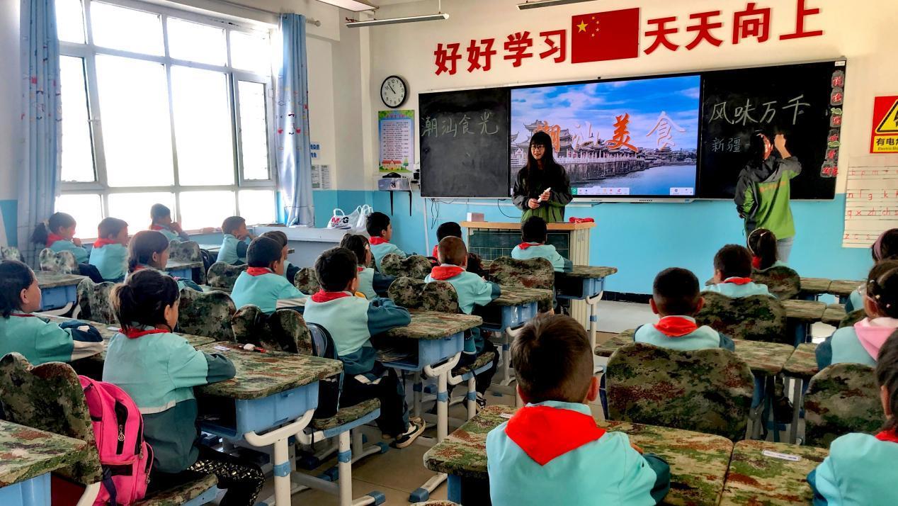 三(1)班的“潮汕美食”趣味语文课堂也在有序进行。韩山师范学院的陈少真同学以图文并茂的形式,将新疆美食馕和潮汕美食——粿,联系起来。课上,全体同学用新学的潮汕方言齐诵“我爱中国”“我爱新疆”,稚嫩童声回荡在帕米尔高原,课堂别开生面,趣味盎然。