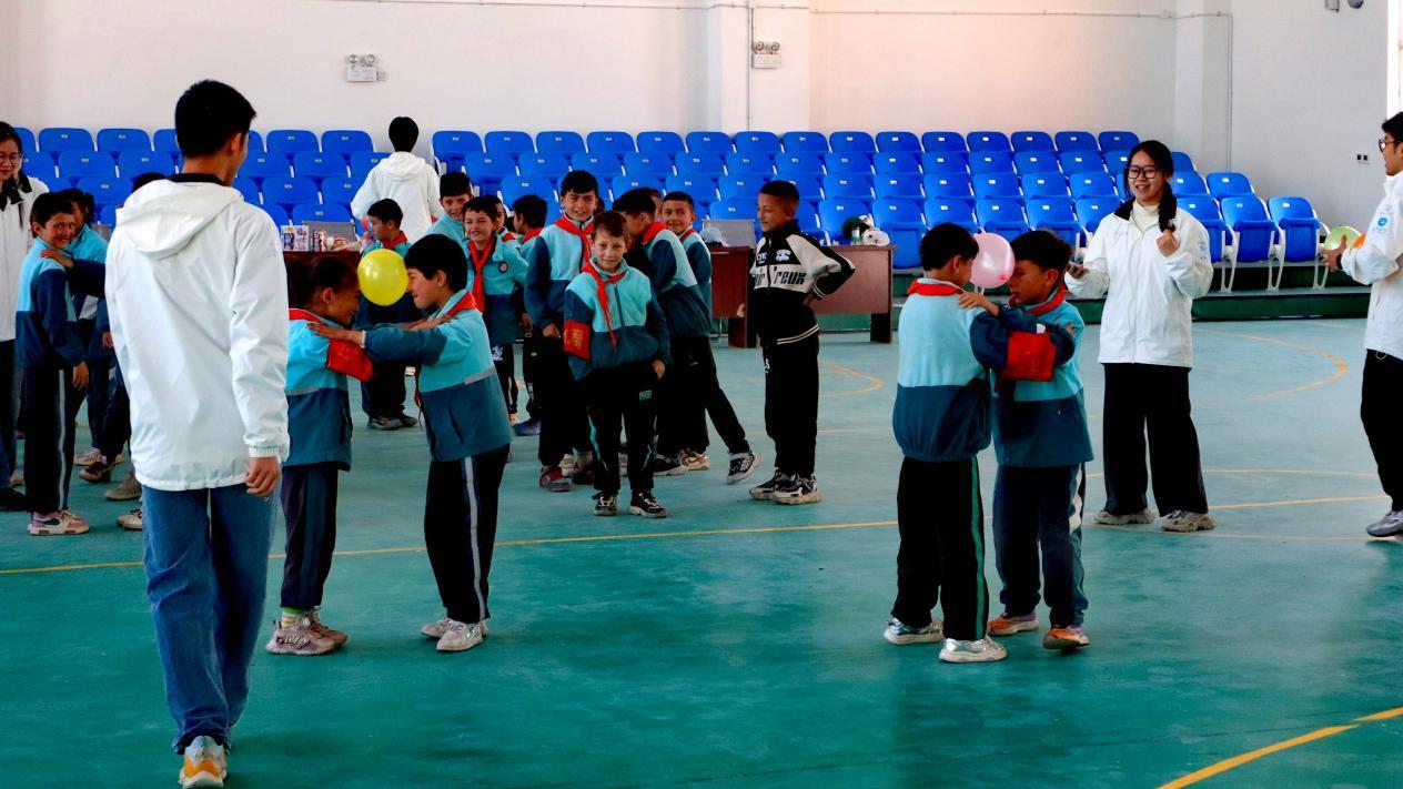 体育馆中,三(2)班的孩子们正充满着朝气、期待着体育课。嘉应学院的梁健艺和队员们策划了“顶碗竞走”和“鸿运当头”游戏,孩子们两两搭档,用额头默契地顶着气球,以接力的形式进行折返跑。他们紧紧相依,步伐协调一致,向着目标奋力奔跑,加油声、欢笑声交织成一曲欢快的乐章。