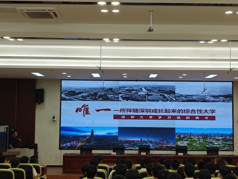 在招生宣传讲座中,秦毅系统介绍了深圳大学的发展历程、学科建设、校园文化与就业前景,展示了深大作为特区大学的办学特色与综合实力。