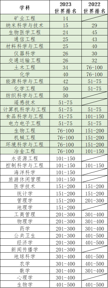 39个上榜学科中,有20个学科进入世界前100,数量并列内地高校16名;其中,矿业工程、纺织科学与工程、遥感技术、食品科学与工程、生物工程、机械工程、环境科学与工程、冶金工程为新增世界前100学科。