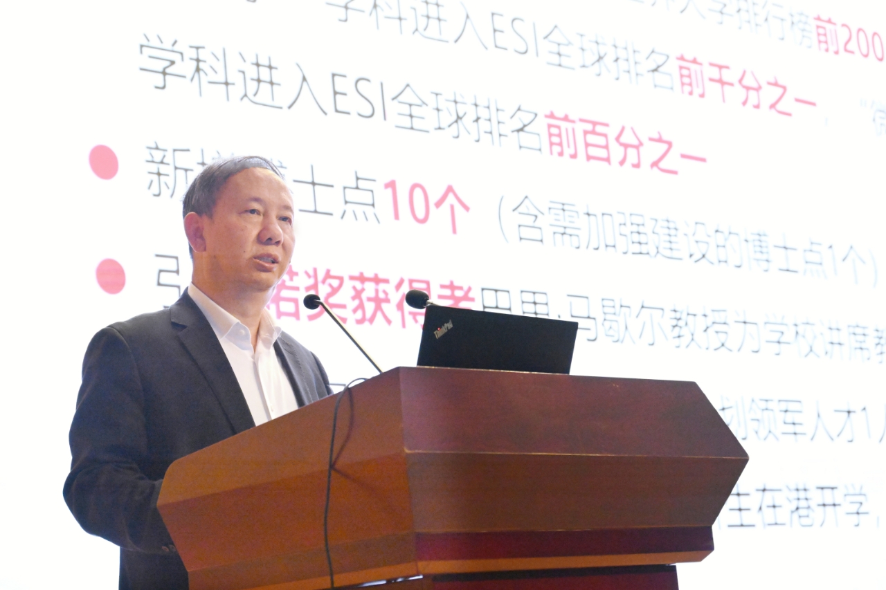 毛军发以“赓续前行,全力推进‘双一流’创建”为题,对本学期行政工作作出总结。他指出,2024年是实现学校“十四五”规划目标、加快创建双一流大学的“淮海战役”之年,学校各方面建设成果可圈可点,学科建设稳中有进,师资队伍建设和人才培养取得实效,教学改革、专业建设、教材建设、学生创新创业等方面进展明显,数智赋能学生工作颇具亮点,科研创新再攀高峰,国际化建设又结硕果。他特别指出学校2024年的十大标志性工作进展:学校在US News排行榜位列第187,继软科之后,再次进入公认的四大权威世界大学排行榜前200名;化学学科进入ESI全球排名前千分之一,微生物学、经济学与商学学科进入ESI全球排名前百分之一;新增博士点10个(含需加强建设的博士点1个),新增数量并列全国第一;引进诺奖获得者巴里·马歇尔教授为学校讲席教授,17名“海外优青”获评通过,创历史新高;深圳大学香港学院首届95名新生在港开学,是首个赴港开办本科办学机构的内地高校;学校2024高考录取分数线再创新高;巴里·马歇尔教授获中华人民共和国国际科学技术合作奖,学校国家与省级文科奖项均创新高;首次获批国家自然基金创新研究群体项目和国际合作创新研究团队项目,首次获国家基金青年学生基础研究项目(博士研究生)申报资格并获10个项目;咨政服务工作有新贡献;获2024年度中国国际大学生创新大赛国赛4枚金牌,深大学子在2024年巴黎奥运会共为中国队夺得3金2银3铜,创深圳大学运动员参加奥运会历史最佳成绩;学校粤海校区一号天桥已开通人行功能。此外,学校附属医院顺利运行,“双百行动”工作推进顺利。