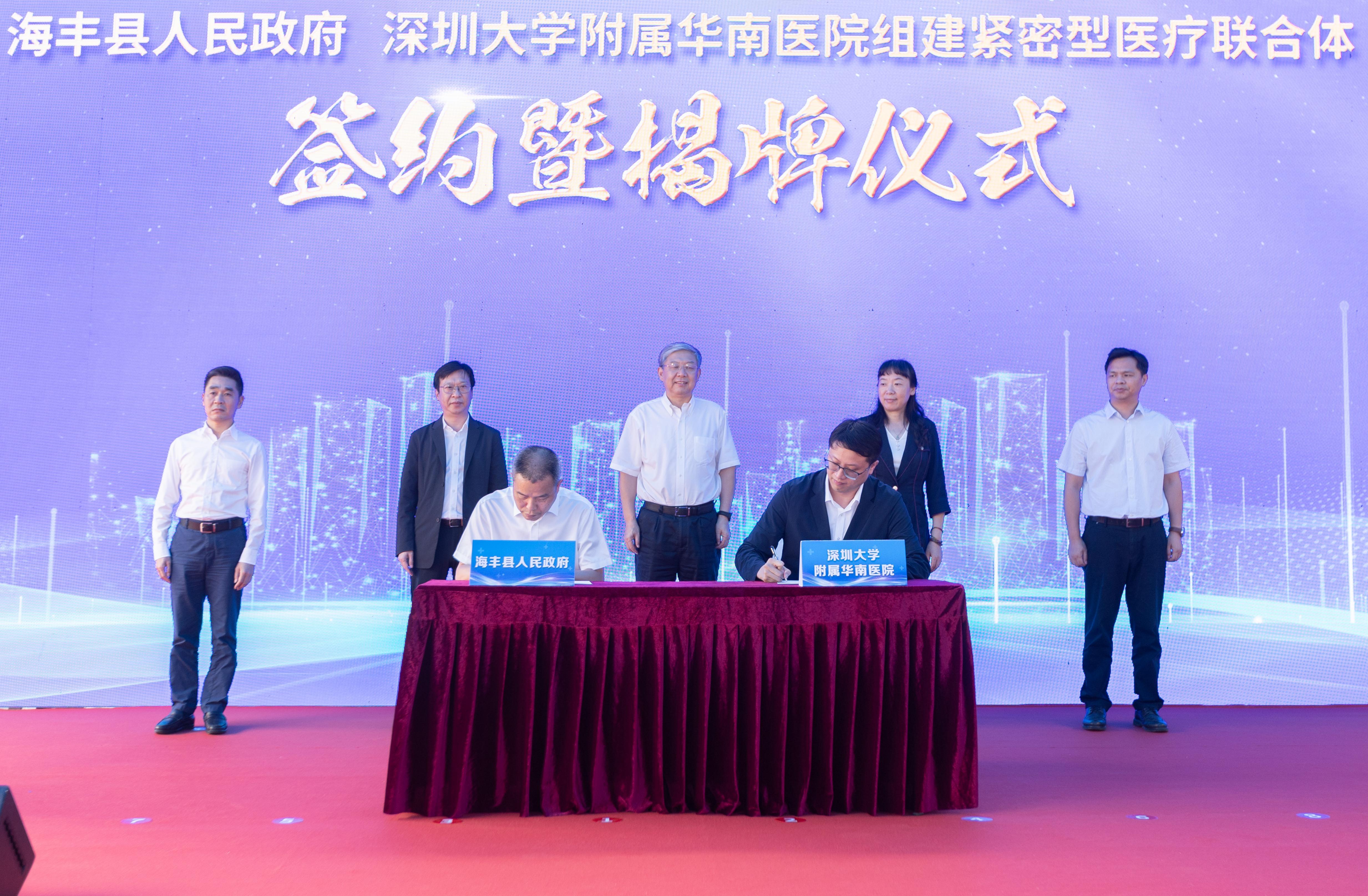 深圳大学党委书记李清泉、汕尾市副市长庄红琴、海丰县委书记郭文炯,海丰县委县政府、人大常委会、政协和汕尾市卫生健康局相关领导,深圳大学发展规划部、深大华南医院相关负责人,深圳大学驻海丰服务队成员以及深大华南医院17名专家教授出席签约揭牌仪式。