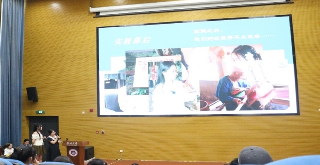最后,管理学院“小院大成”实践团的代表王梦娇和潘泳瑶同学,以她们在“百千万工程”中的亲身经历为切入点,详细回顾了队伍与当地居民的深入互动以及项目从策划到实施的全过程。这些实践经验不仅丰富了在场师生对“百千万工程”的理解,也为大家提供了一个真实的参考范例。除了对“百千万工程”的实践经历进行分享,两位同学还对自己参加相关赛事的经验进行了分享,为同学们提供了宝贵的建议。