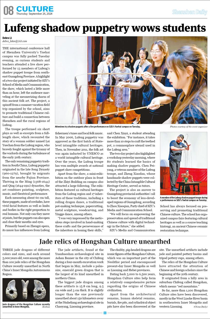 THE international conference hall of Shenzhen University’s Yuehai campus was fully packed Tuesday evening, as curious students and teachers attended a live show performed by 13 members of Lufeng’s shadow puppet troupe from southeast Guangdong Province. A highlight of a two-day project initiated by SZU’s School of Media and Communication, the show, which lasted a little more than an hour, left the audience marveling at the mesmerizing charm of this ancient folk art. The project, a spinoff from a summer vacation field trip organized by the school, aims to promote traditional Chinese culture and build a connection between Shenzhen and the rural regions of Lufeng.