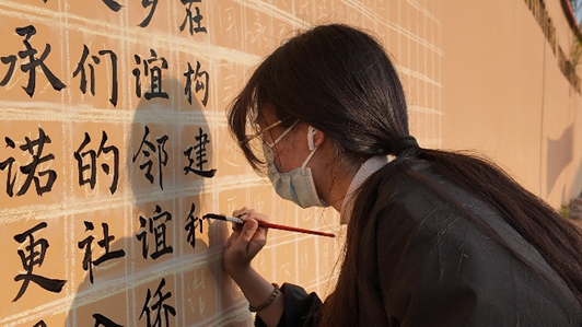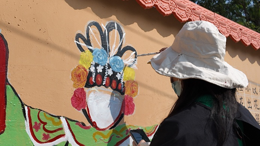 在甲子镇,经资料搜集和现场走访,在这五天的实践活动里,同学们以“甲子英歌”为主题,为百米长廊创作了“甲子英歌”主题文化墙,将甲子英歌舞的元素展示在大家面前。同学们耐心细致,一笔一划勾勒人物形象,这一宝贵的文化符号顿时栩栩如生,跃然墙上。