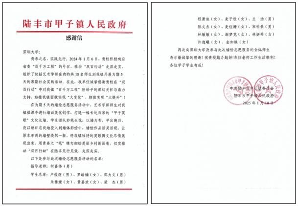 经过实践队伍同学们的共同努力,本次寒假实践活动成果丰硕,得到了晶报、陆丰市电视台和“深圳汕尾协作共建”公众号的报道,更多市民得以对本次实践活动的成果有所了解。在实践活动结束后,陆丰甲子镇人民政府和甲西镇人民政府分别为我部发来感谢信,星都经济开发区管委会为实践队伍赠送了锦旗。