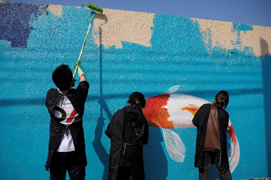 前往甲西镇的实践队伍则充分提取了当地特色,从水稻、农田、锦鲤、鱼池等元素获取创作灵感,在村庄墙壁上精心绘制了一幅幅饱含乡村气息与自然之美的画卷。经过同学们的创作,池中锦鲤活灵活现,丰收的田野祥和宁静,把甲西镇的特色展现在这长墙上。