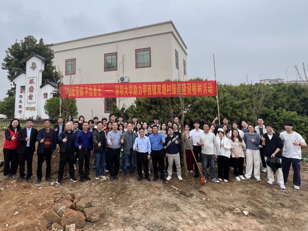 3月12日,在第47个植树节来临之际,“双百行动”驻陆丰市服务队联合中共甲西镇委员会、甲西镇人民政府、驻甲西镇帮扶工作队,组织深圳大学师生党员代表,在甲西镇双塘村开展“植此青绿 不负春光”植树活动。汕尾市委政法委政治处主任陈俊佳、深圳大学经济学院党委副书记张建华、“双百行动”驻陆丰服务队队长、深圳大学后勤保障部副主任邵存才、“双百行动”驻陆丰服务队副队长、广东交通职业技术学院智慧交通学院党委副书记刘可、陆丰市政协副主席、甲西镇党委书记郑俊腾、驻甲西镇帮扶工作队队长李宇等出席活动,共同参与本次植树活动。