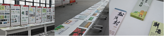 二十四块展板沿墙铺开,包含展览海报、前言结语及二十个村庄的实践故事。大屏幕上滚动播放着学生团队为清远连璋村、陆丰蛟溪村等地拍摄的文旅宣传短片,镜头中的稻田祠堂与展板上的手绘地图相映成趣。展台中央陈列着学生设计的特色文创:三折页导览图串联起村落游览动线,明信片以吴川新村墙绘、陆丰双塘村古建等为创作元素,民俗月历则用剪影还原佛山松塘村场景。