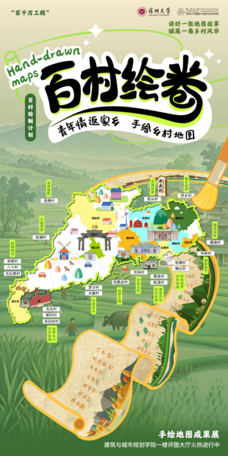 在乡村振兴战略指引下,深圳大学建筑与城市规划学院积极发挥专业优势,践行育人使命。即日起至4月13日,学院一楼评图大厅正举办2025年寒假手绘地图社会实践成果展。展厅内,手绘地图如岭南长卷徐徐展开,讲述着“百千万工程”突击队用脚步丈量广东乡村的振兴故事。