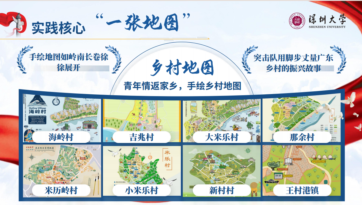 在广东省“百千万工程”与“双百行动”的号召下,深圳大学建筑与城市规划学院党委发起“百村绘卷”项目,依托本科师生联合党支部,将党建工作与专业实践深度融合。23支由本科师生联合党支部的党员骨干带领的青年突击队,奔赴汕尾、湛江、清远等地的33个村落,以“画好一张手绘地图,讲好一个乡村故事”为理念,通过手绘地图、文创设计、绿美规划等方式,探索出一条党建引领、师生共建的高校服务乡村振兴新路径,为南粤乡村带来了可触可感的青春活力与发展动能。