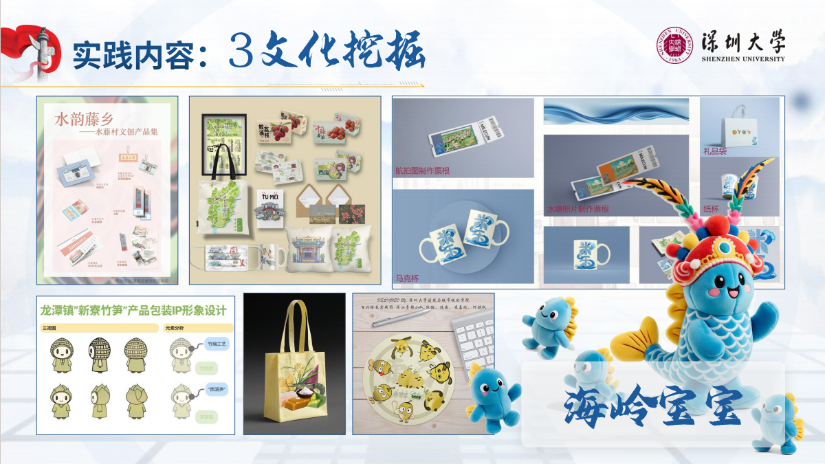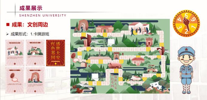 如果说手绘地图是记录,那么文创设计则是激活。在党员教师的专业指导下,青年学子的智慧正转化为乡村发展的创新动能。在吴川王村港镇,团队为海岭村设计了融合渔家文化与粤剧元素的吉祥物“岭仔鱼”,为村庄打造文化名片;在深汕特别合作区大安村,团队创新设计“红色基因,盛世大安”互动卡牌游戏,将村里19处红色革命遗址转化为生动有趣的教育节点。此外,揭阳华林村的集章动线、梅州侨乡村的围屋手绘、惠州范和村的饮食明信片……这些可感知、可携带的文创产品,让厚重的岭南文化以轻盈的方式“飞入寻常百姓家”,文创设计荣获广东省“文创+”大赛二等奖。从吉祥物到互动卡牌,深大学子设计的文创产品让乡村文化变得可感、可亲、可带走。